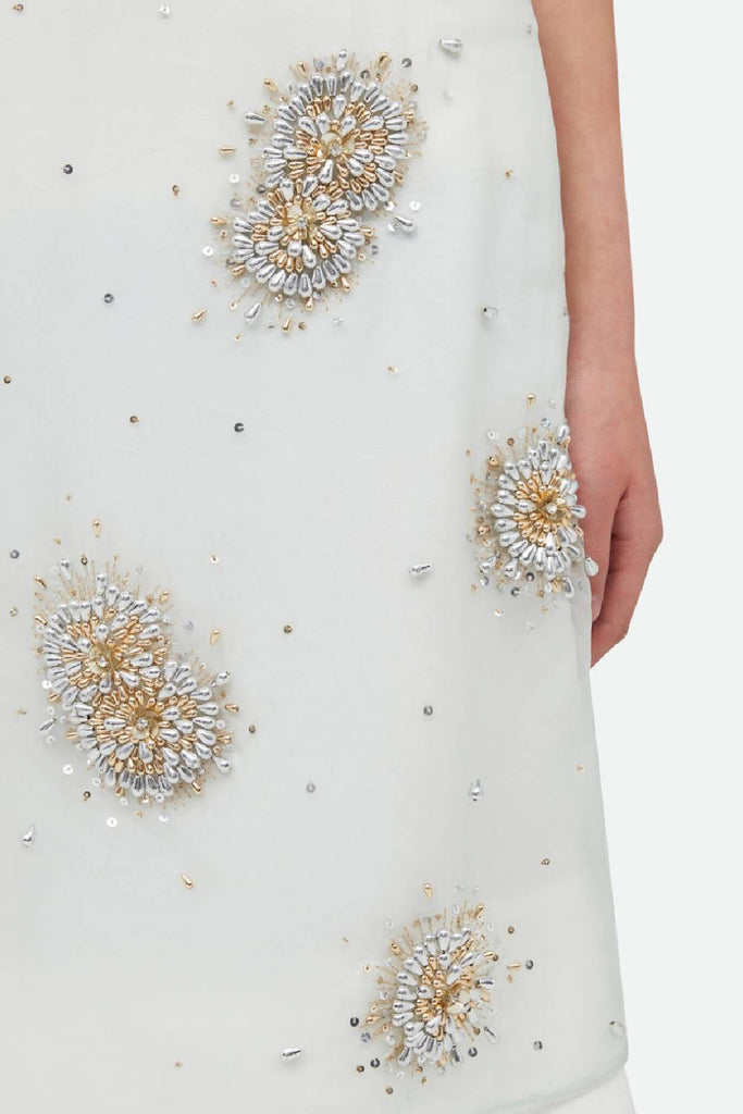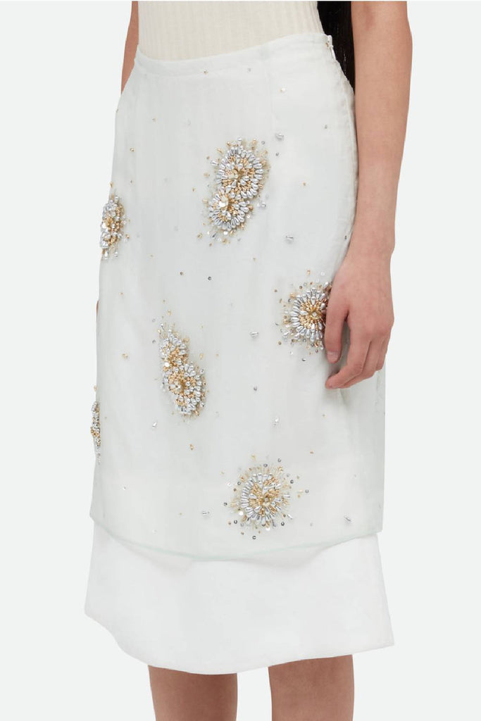 Pistachio green organza skirt with intricate metal and bead embroideries and a crinkled viscose double-layer lining.