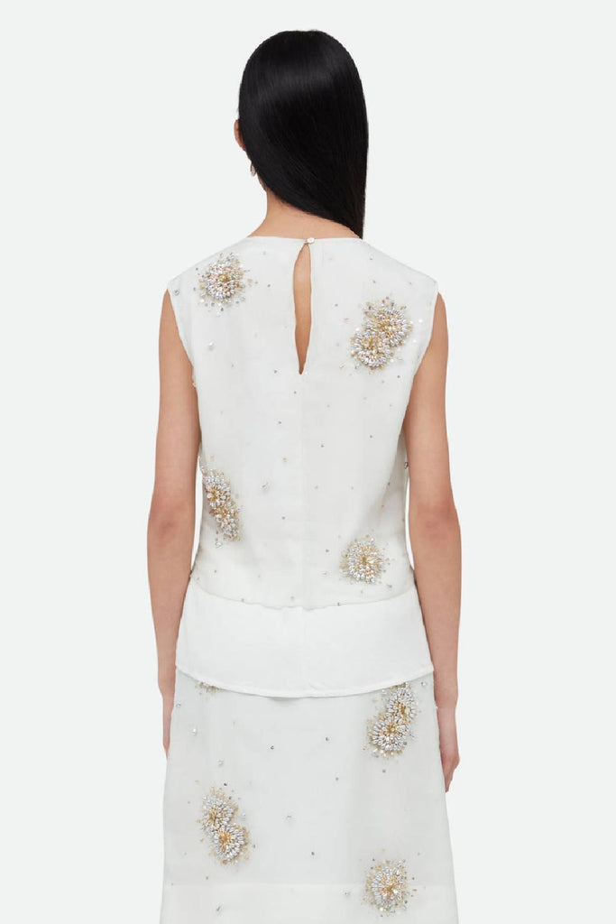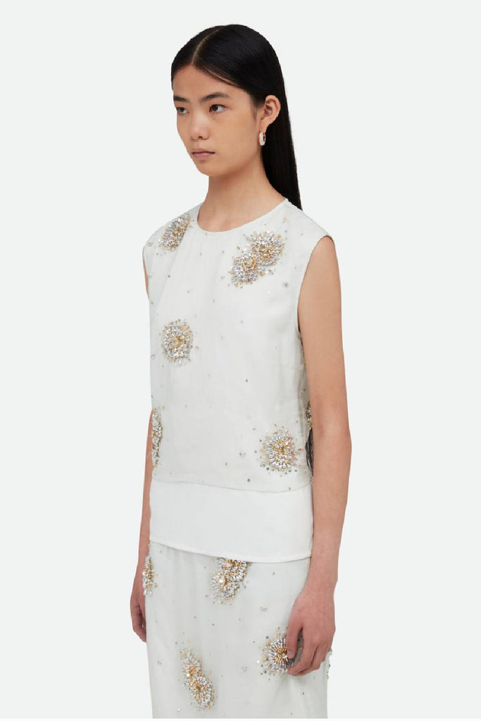 Sleeveless organza shirt with intricate metal and bead embroideries and a crinkled viscose double-layer lining.